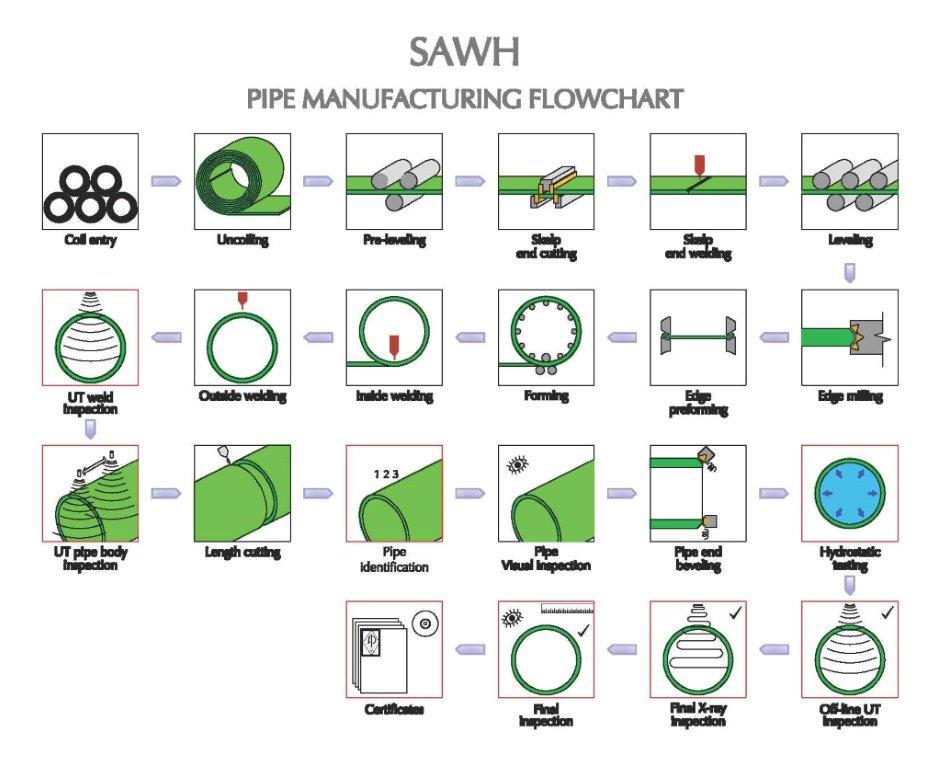 Borular bir dizi şekillendirme makarasından geçirilerek istenen dış çap ve doğrusallığa getirilir. Borular, son olarak boru ile eş zamanlı hareket eden bir uçar makasla istenilen boylarda kesilir. Kaynak ağzı, hidrostatik test ve tahribatsız muayene aşamalarından geçen borular, proje ve müşteri taleplerine uygunluk için son kontrol işlemlerine tabi tutulur.